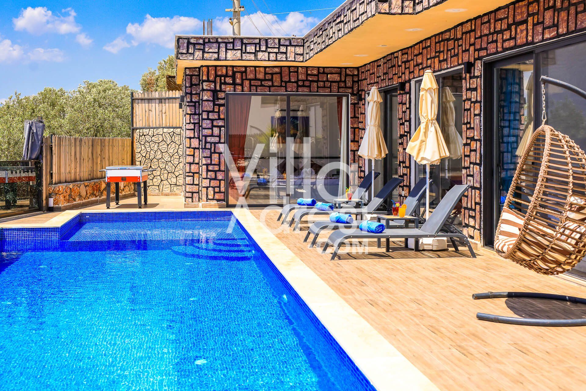 Kalkan Çavdır mevkisinde yer alan villamız 2 yatak odasına sahip 4 kişilik doğa içerisinde kiralık muhafazakar villalarımızdandır. Kalabalık ve gürültüden uzakta , çocukları ve ailesi ile huzurlu bir tatil hayali kuran misafirlerimiz için uygundur. Korunaklı havuz terası ile muhafazakar misafirlerimize hitap eden villamızın havuz terasında langırt,çocuk oyun alanı ,masa tenisi ,tranbolin ve de barbekü bulunmaktadır.
